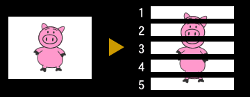 左の1枚の画像を横の線で5つに分割し、 上から順に番号をつけます。 この5本の横の線が走査線です。 |
