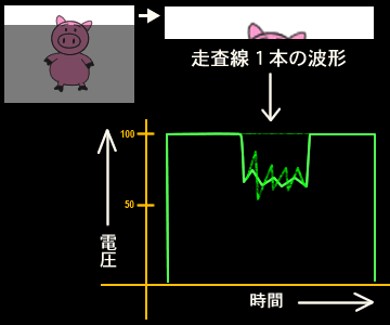 波形モニターで表示すると(通称:ハケモニ) 波形モニターとは、特に撮影に扱い安くした オシロスコープです。通常、信号の状態は 目で見ることはできません。 波形モニターは信号の状態を電圧の 高低で表示します。 電圧の高低は画像の明るさになります。 |